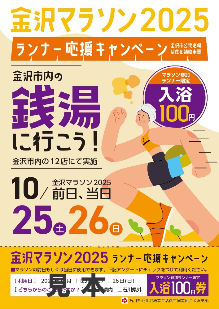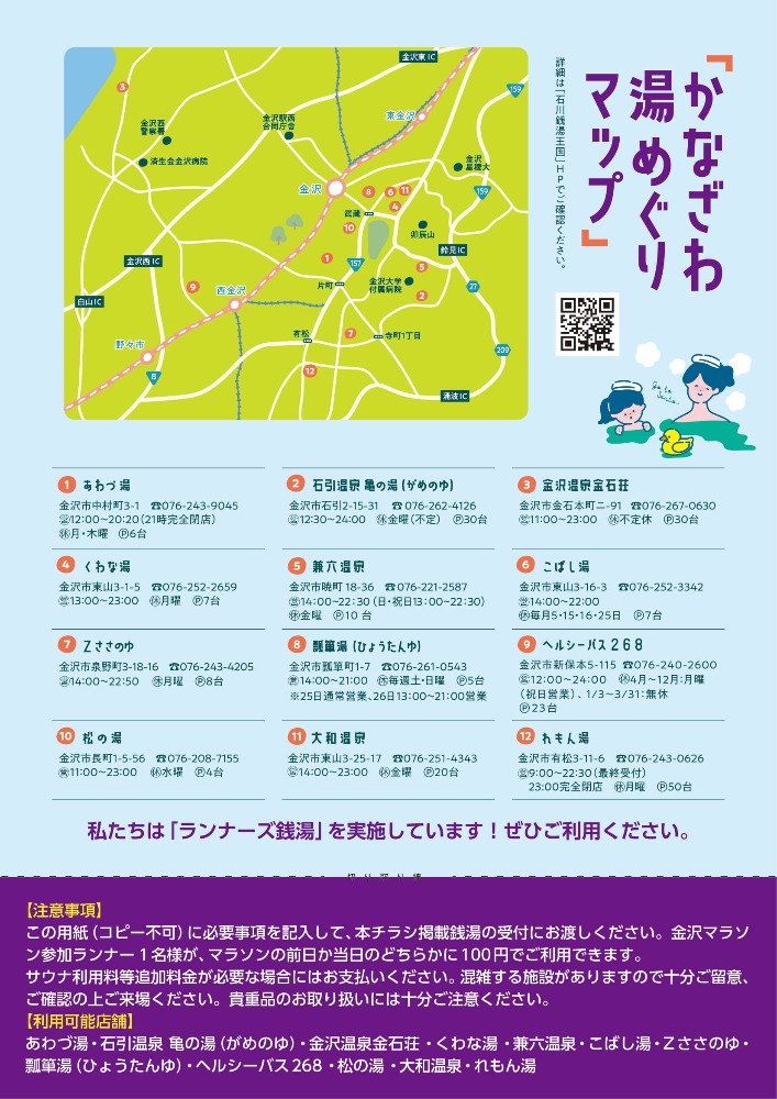 対象店舗にて、マラソンの前日もしくは当日のどちらかに利用できる入浴100円券がついていますので(ランナー限定)是非、ご利用ください♨