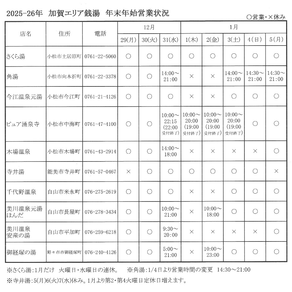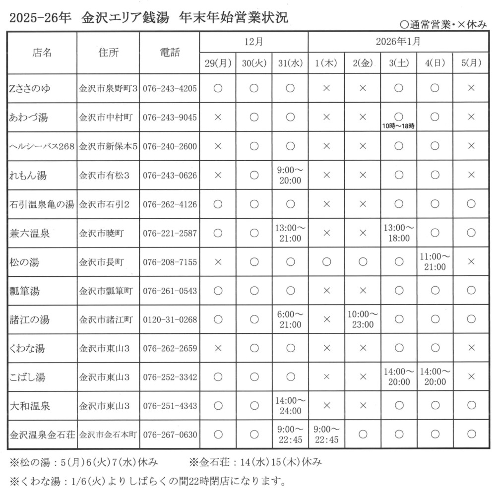 石川県内の銭湯の年末年始の営業状況をまとめました。