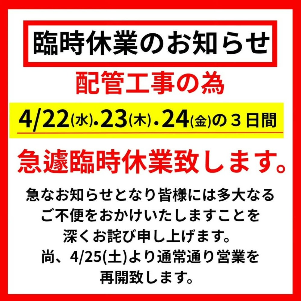 配管工事のため3月22日㈫・23日㈬・24日の3日間臨時休業します。